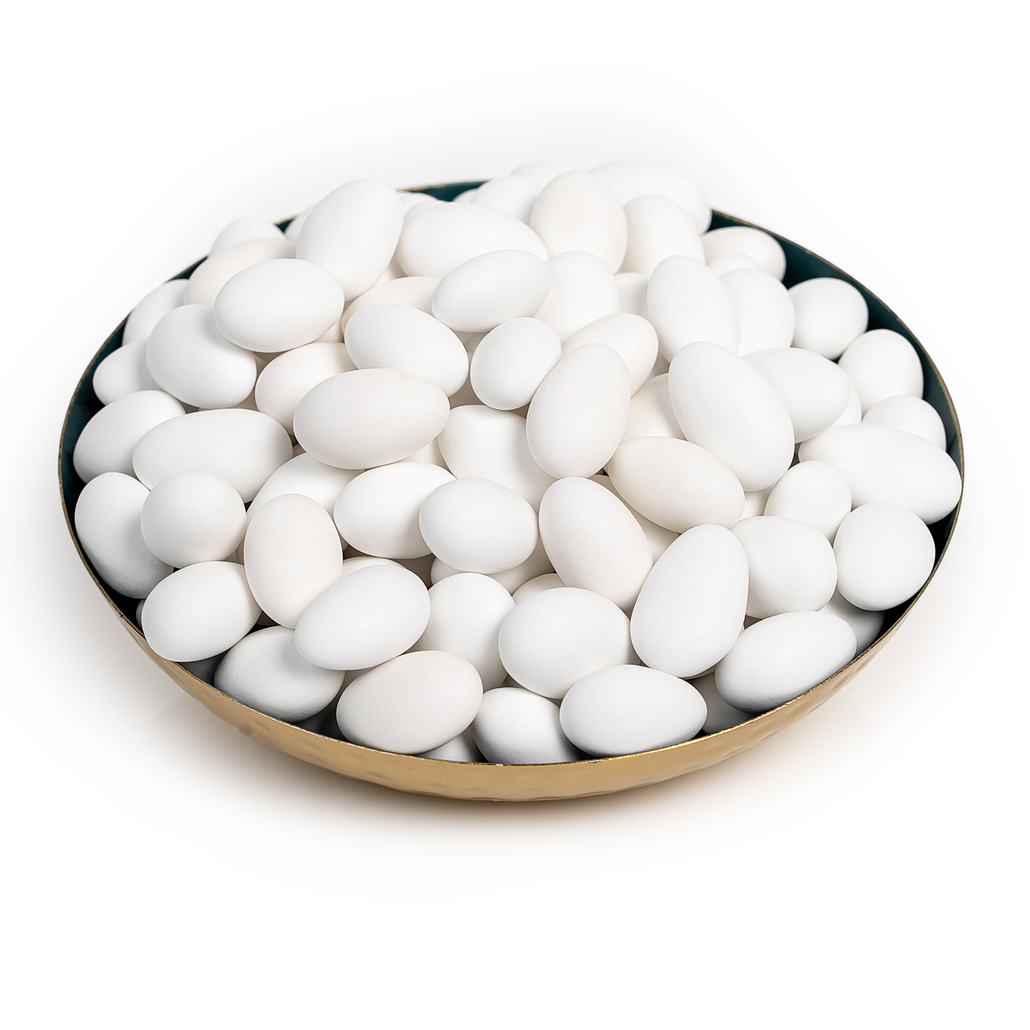 Ολόκληρο καβουρδισμένο αμύγδαλο και λευκή σοκολάτα με λεπτή επικάλυψη ζάχαρης και γεύση καραμέλα. Τμχ/kg: 220-240 (±10)